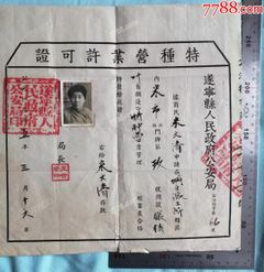 營業(yè)執(zhí)照:1955年逐寧縣頒發(fā)給米文清的《特種營業(yè)許可證》(旅棧),詳細品相看圖